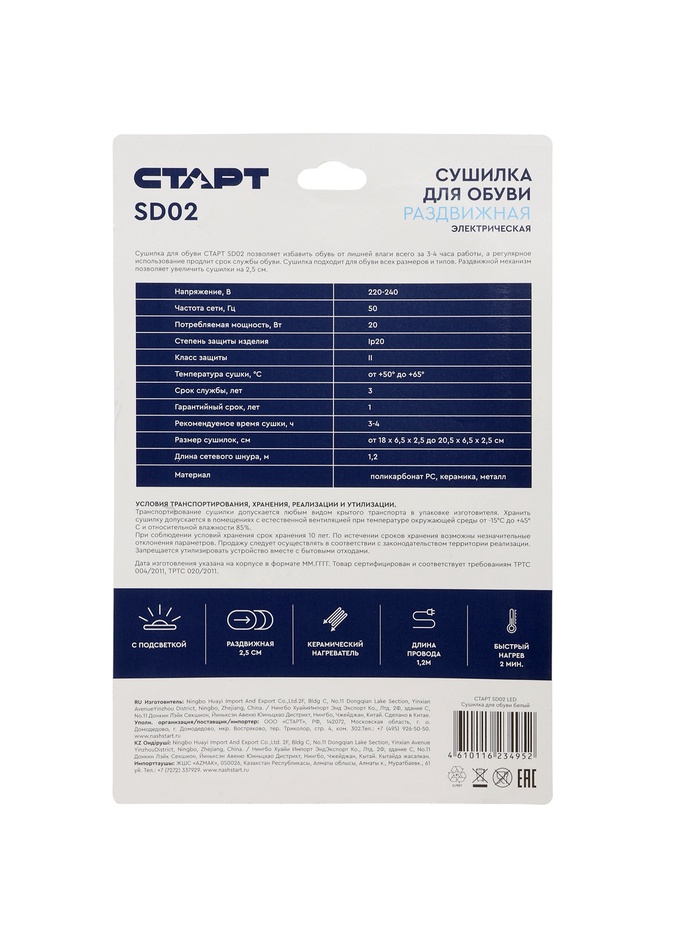 Сушилка для обуви «Старт» SD02, 13 Вт, UV, арома - пластик, керамика, шнур 1.2 м — Характеристики