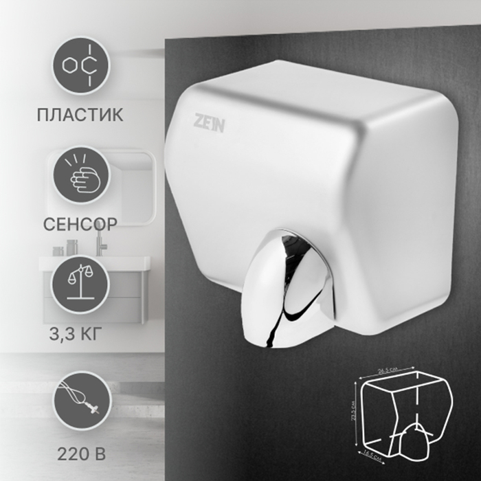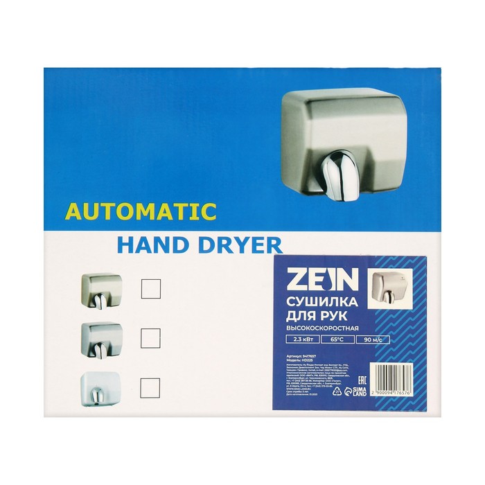 Сушилка для рук ZEIN HD225 — высокоскоростное устройство мощностью 2,3 кВт, обеспечивающее быструю и эффективную сушку рук.