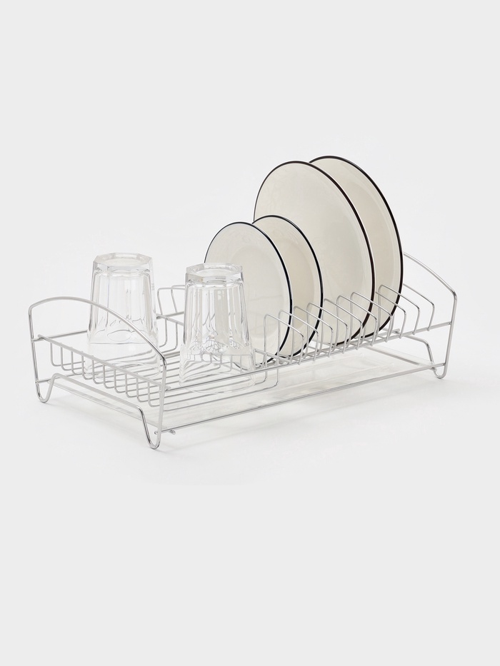 Хромированная сушилка для посуды — компактная настольная подставка с поддоном для стекающей воды. Размеры 39×25×12 см позволяют разместить тарелки, кружки, стаканы и столовые приборы даже на небольшой кухне. Гладкий металл не ржавеет, легко моется и визуально расширяет пространство, а съёмный поддон упрощает уход.