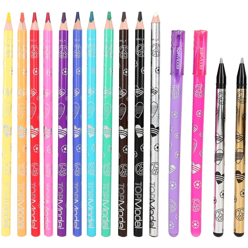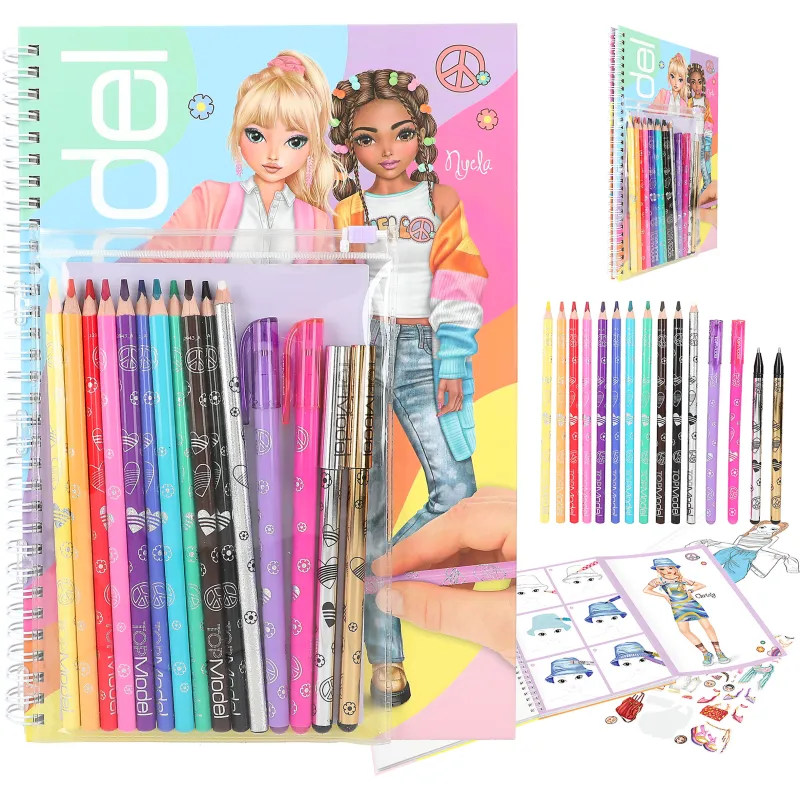 Эта удивительная книга для рисования TOPModel предлагает множество страниц для создания стильных нарядов! В комплекте идут наклейки и цветные карандаши: 10 цветных карандашей, 4 гелевые ручки (фиолетовая, розовая, золотая и серебряная) и 1 ластик.