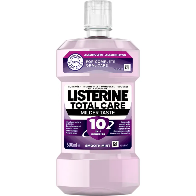 Алкогольный и более мягкий на вкус ополаскиватель для рта Listerine Total Care Milder Taste тщательно очищает всю полость рта. Он также освежает дыхание на срок до 12 часов! Используйте дважды в день после чистки зубов. Подходит для лиц старше 12 лет.