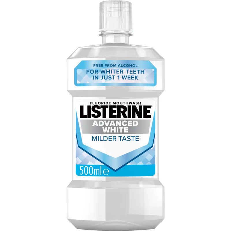 Ополаскиватель для рта Listerine Advanced White помогает добиться белизны зубов всего за одну неделю. Его нехимическая технология на основе полифосфатов удаляет налет с зубов, что способствует их отбеливанию. На поверхности зубов образуется защитная пленка, которая предотвращает появление новых пятен.