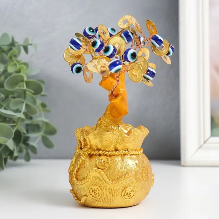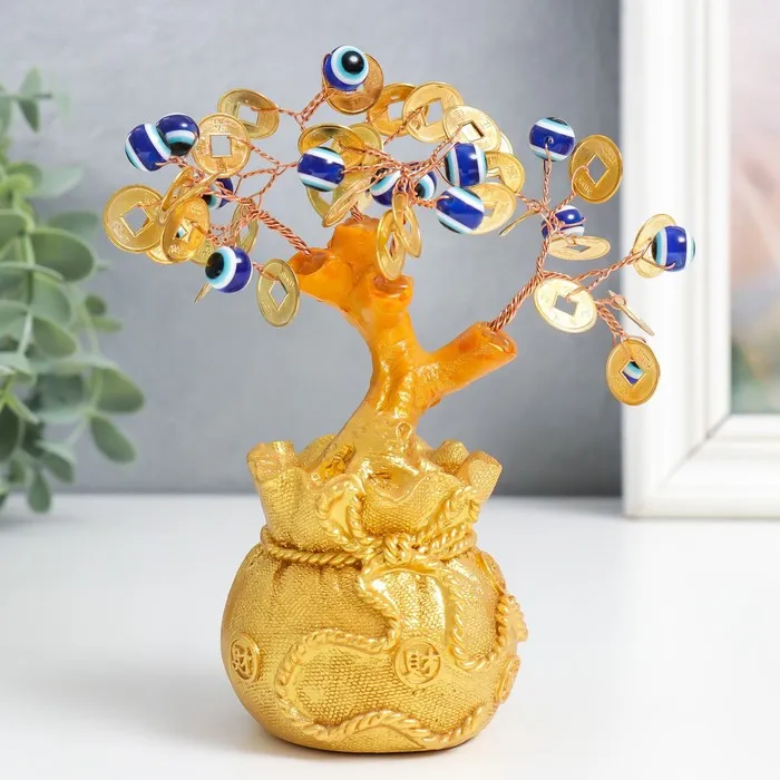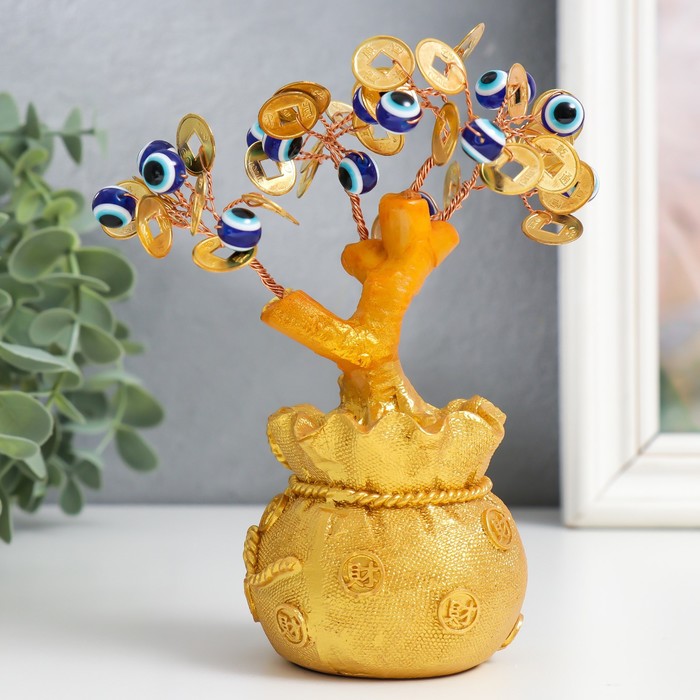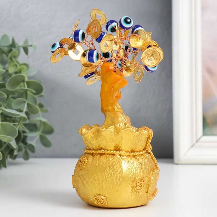 Сувенир бонсай "Денежное дерево в золотом мешке" 16 глазиков, 32 монеты 15х6,5х6 см — Характеристики