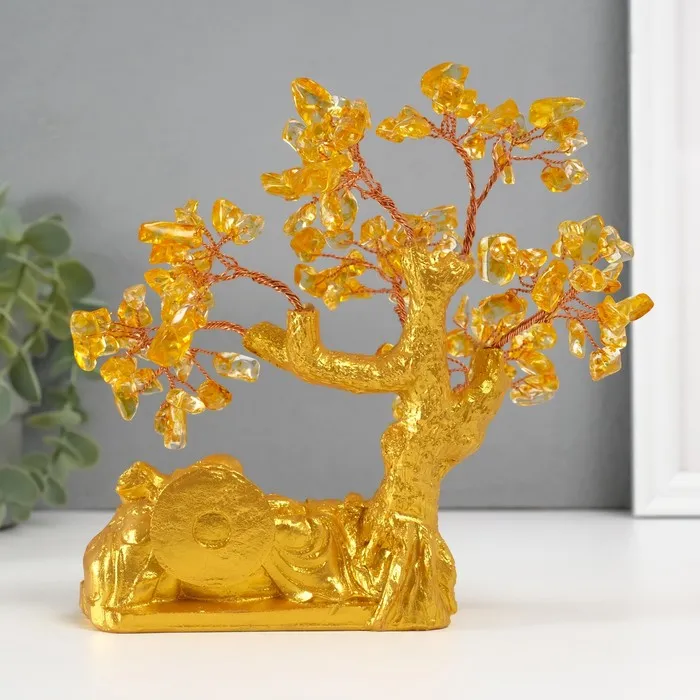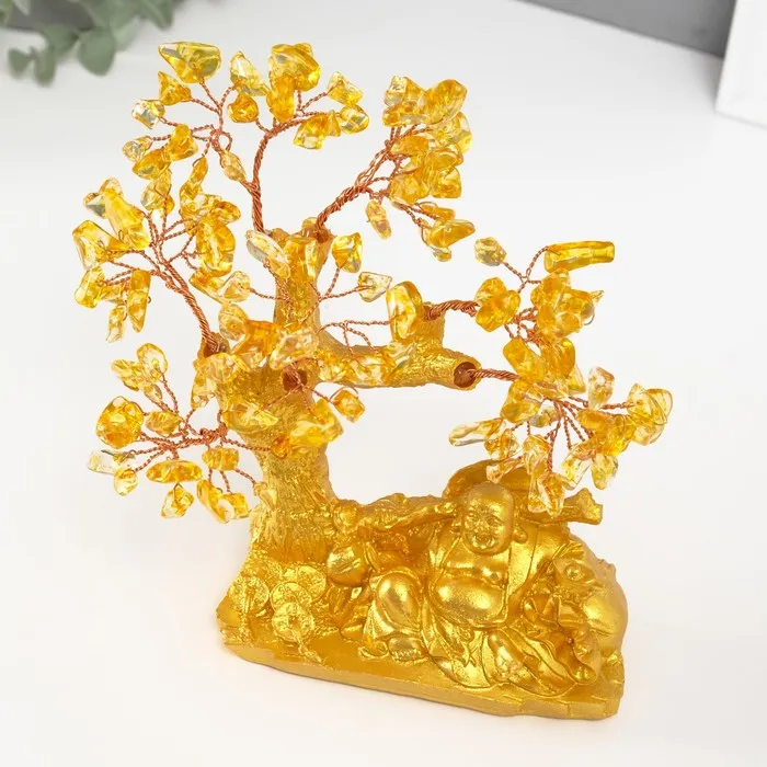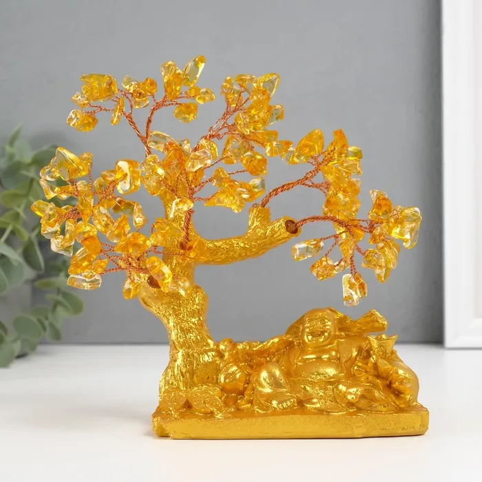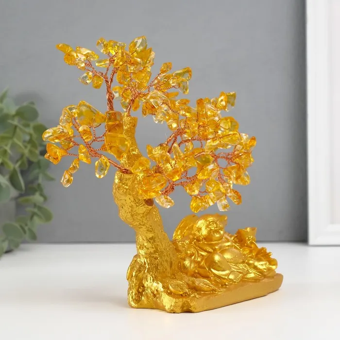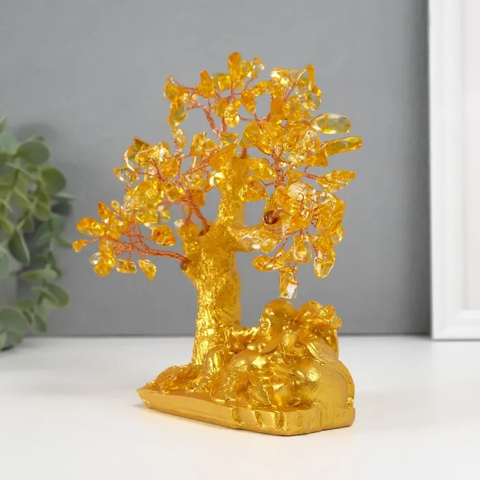 Сувенир бонсай "Хотей с богатствами у денежного дерева" жёлтый 120 камней 13,8х6,2х16,5 см 1047139 — Характеристики