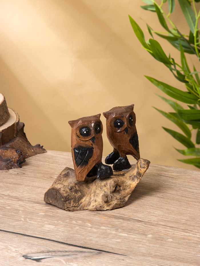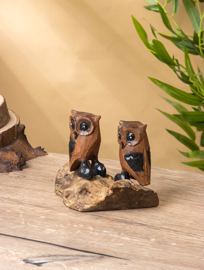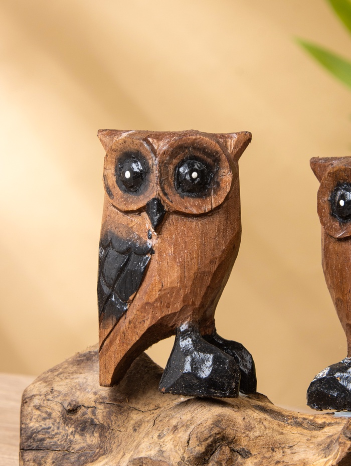 - Фигуры сов и филинов передают характеры: один задумчивый, другой — бдительный.