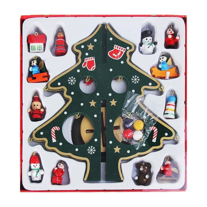 Симпатичные интересные подвески можно расположить по своему вкусу, а золотая звёздочка с красным бантом на макушке завершает тожественный образ лесной красавицы. Деревянная ель на подставке не замёт много места и будет радовать глаз в зимние праздники на протяжении многих лет.