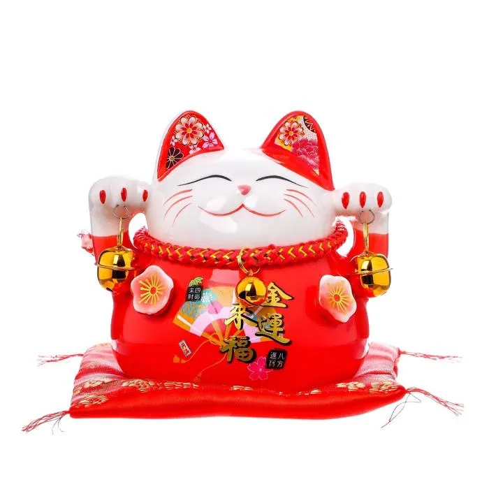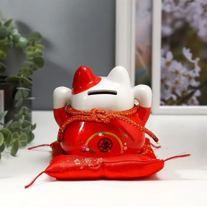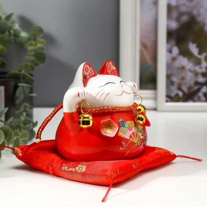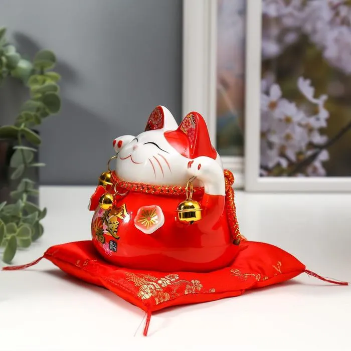 Сувенир керамика копилка "Красный кот Манэки-нэко с колокольчиками" 11,5х11,5х9,5 см — Характеристики