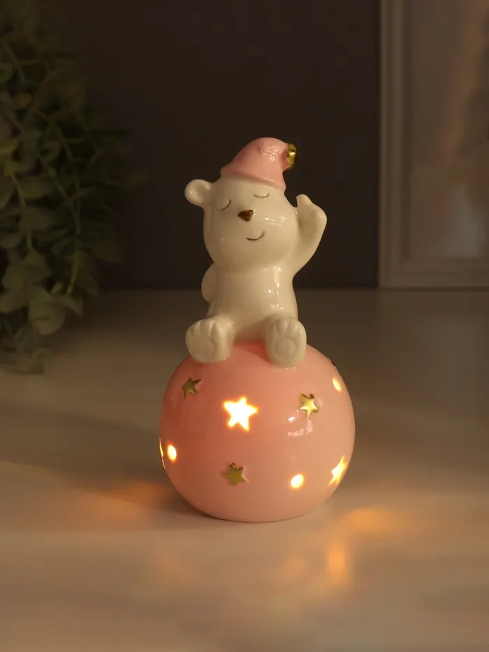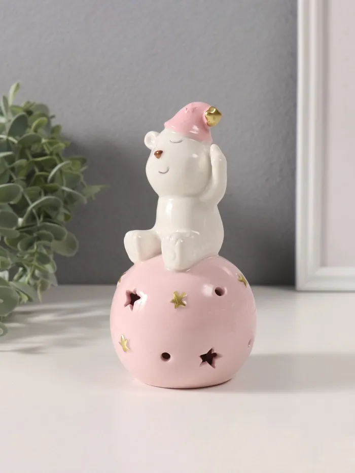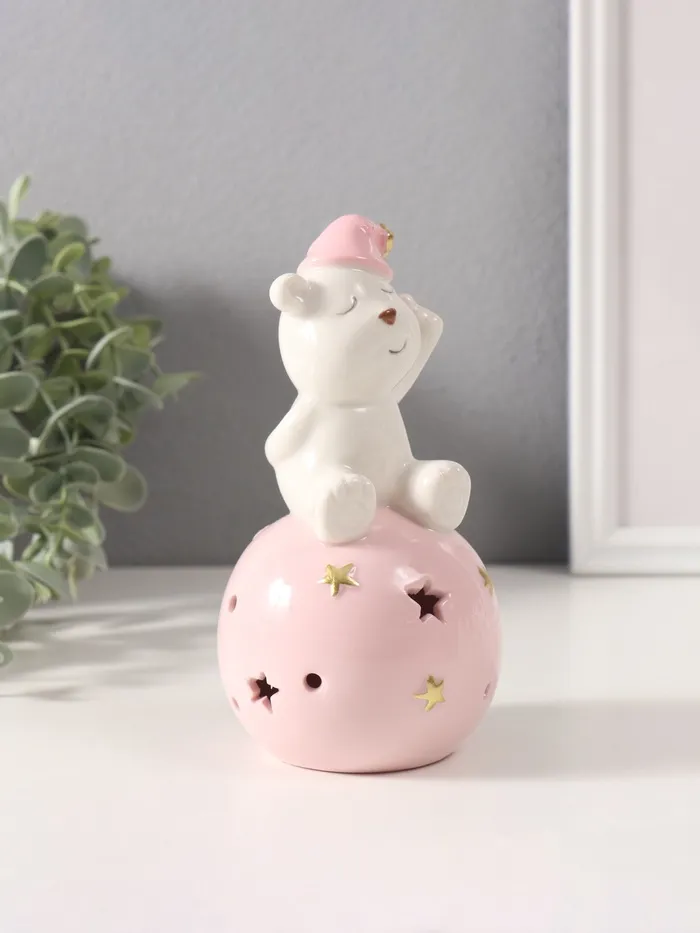 Сувенир керамика свет "Медвежонок в розовом колпаке на шаре со звёздами" 8х8х15 см — Характеристики