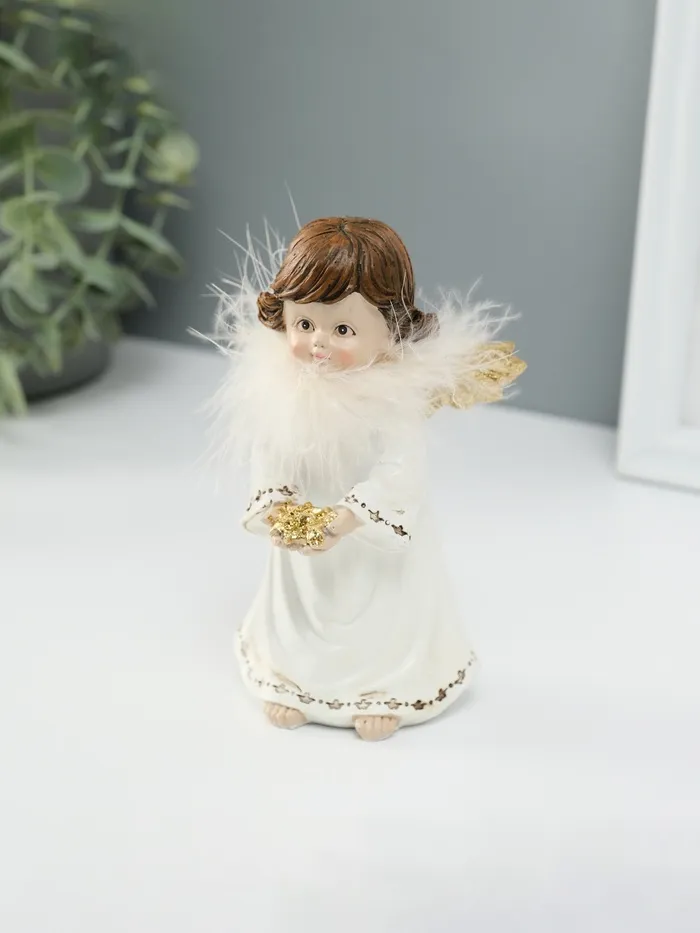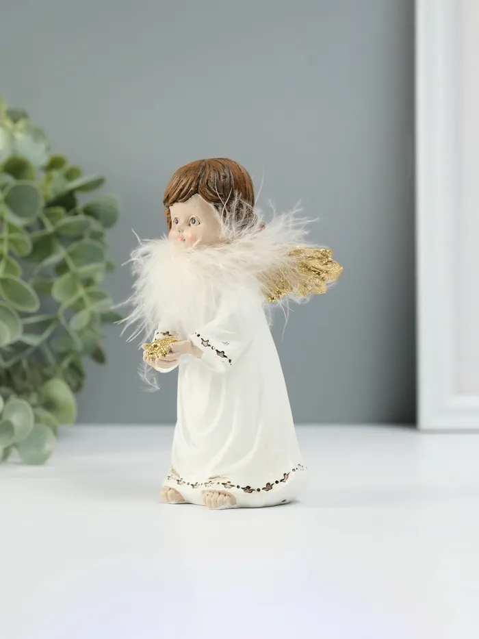 Сувенир полистоун "Ангелочек со звёздами в ладонях" пух, золотые крылья 8,5х7х13 см — Характеристики