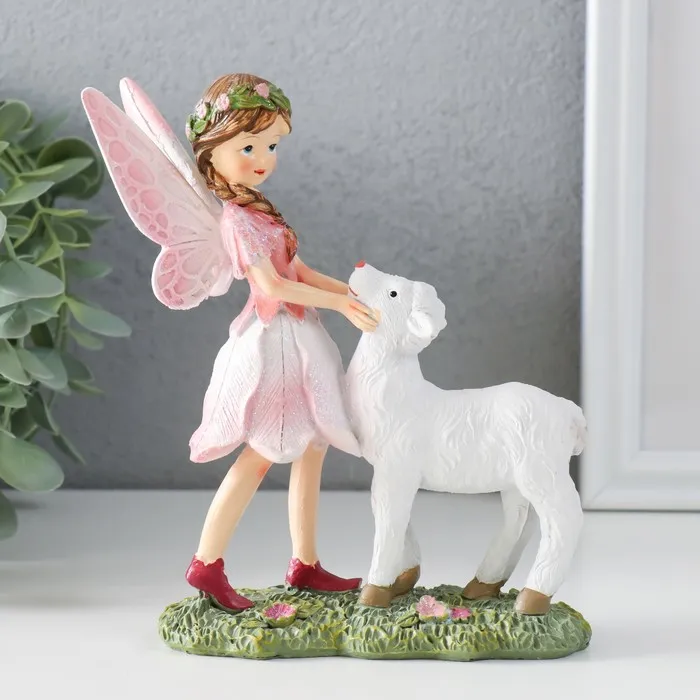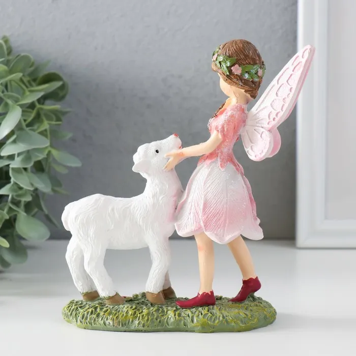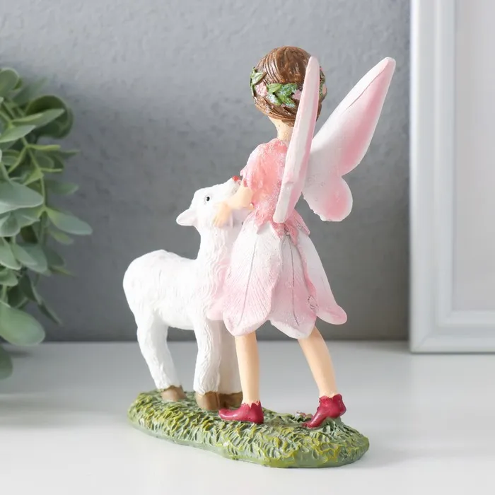 Сувенир полистоун "Девочка-бабочка с барашком на полянке" розовые крылья 13,5х5,5х15,5 см — Характеристики