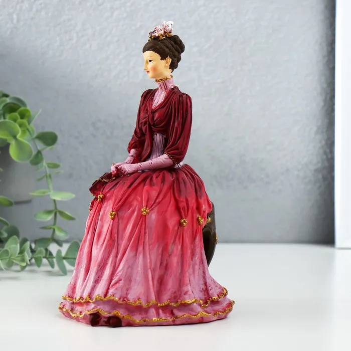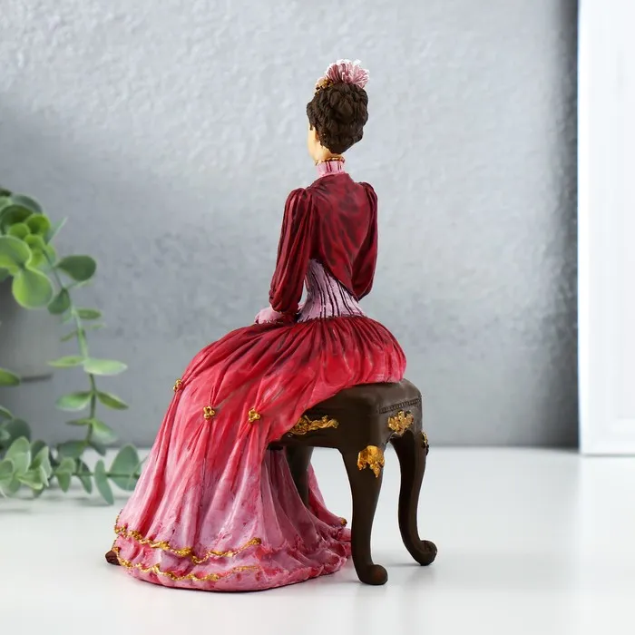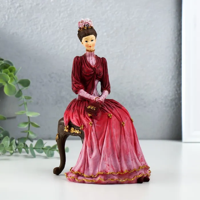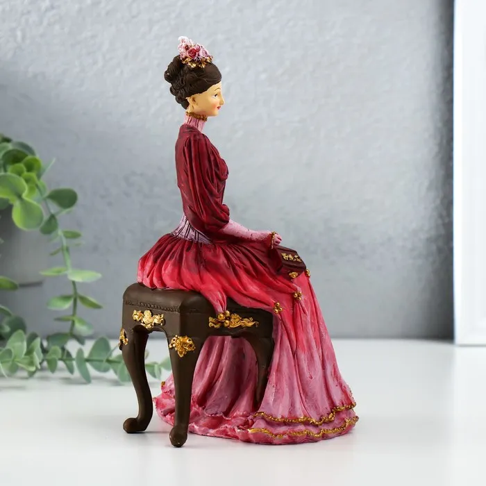 Сувенир полистоун "Мадмуазель в бордовом платье, с сумочкой, сидит на стуле" 13,5х12,5х21 см 98380 — Характеристики