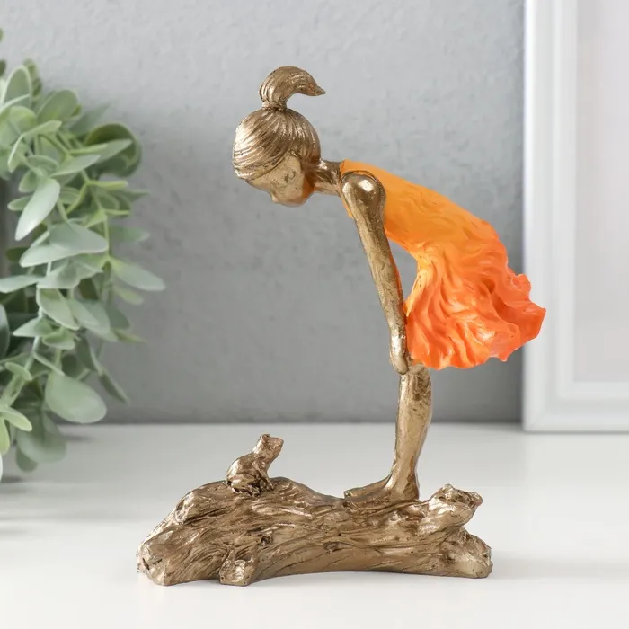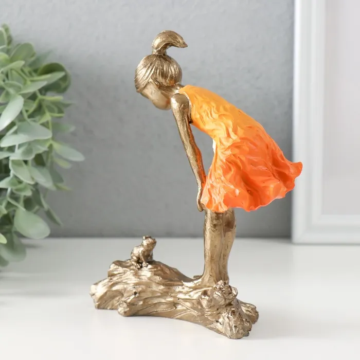 Сувенир полистоун "Малышка и лягушонок" бронза, оранжевый 12х5х15 см — Характеристики