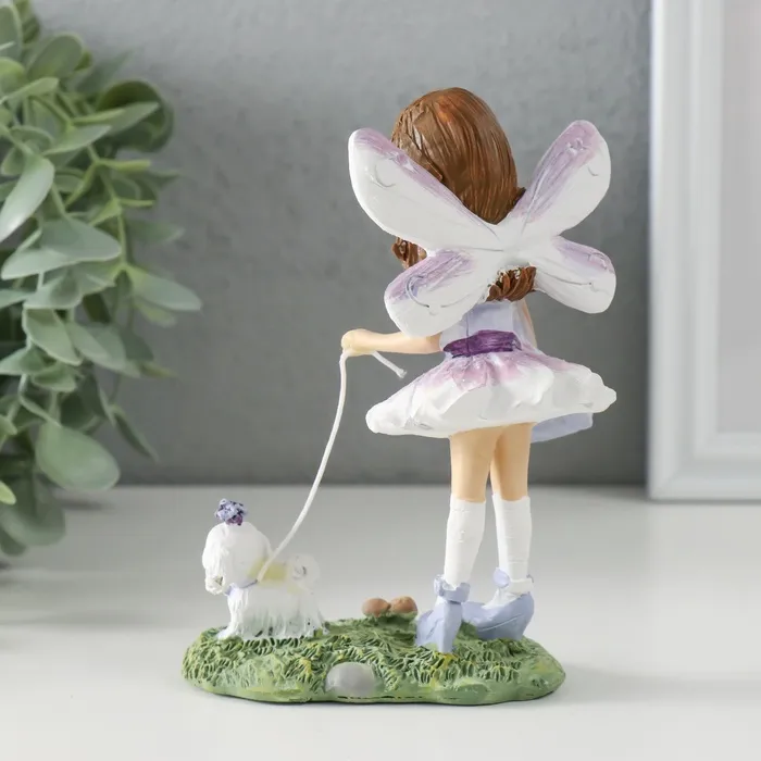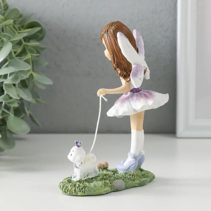 Сувенир полистоун "Малышка в сиреневом платье с крыльями, выгуливает собачку" 10х7х13 см — Характеристики