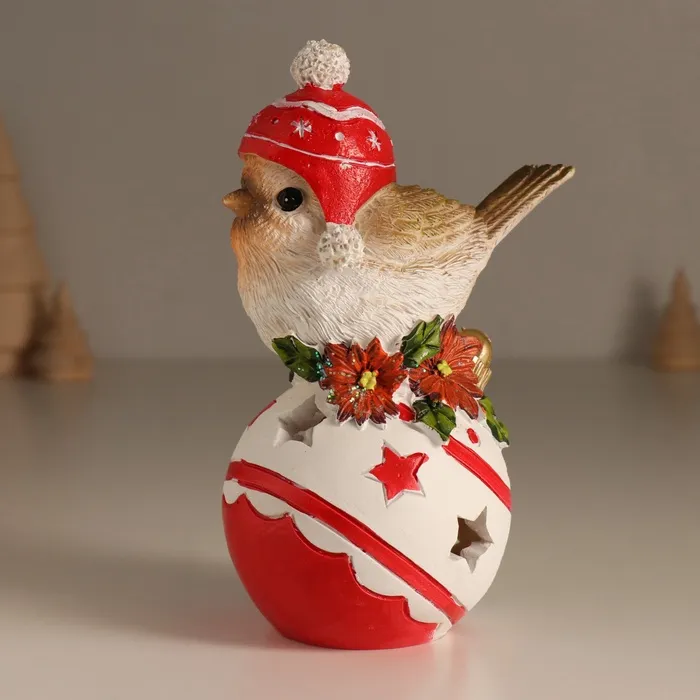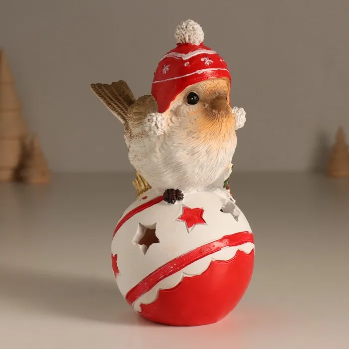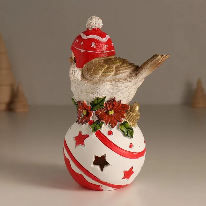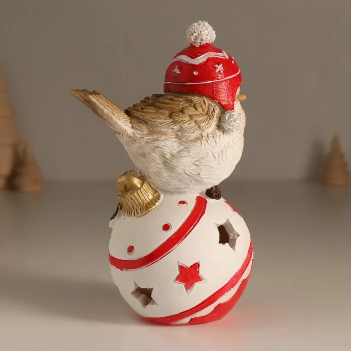 Сувенир полистоун свет "Птичка в шапке с помпонами на ёлочном шарике" 7,5х9,5х15 см — Характеристики