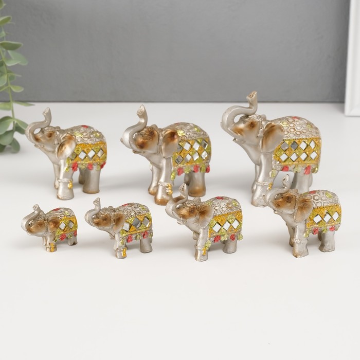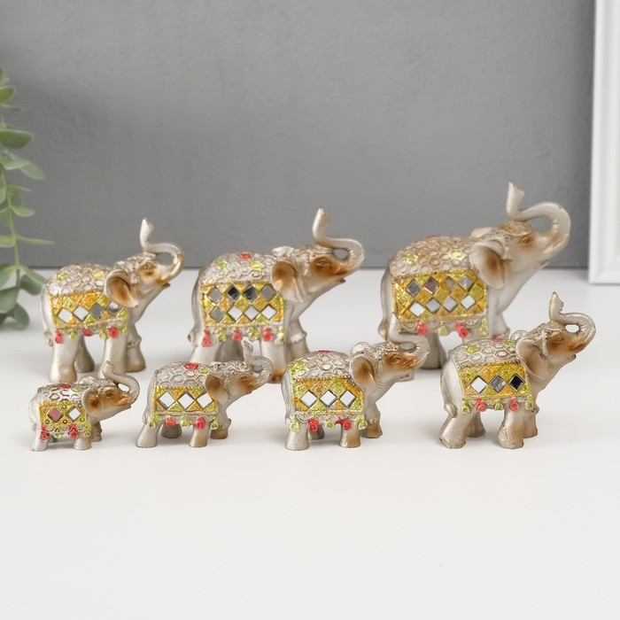 Сувенир полистоун зеркальные вставки (набор 7 шт) "Стадо слонов"11, 10, 8,5, 8, 7, 6,3;5,3см