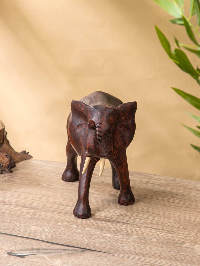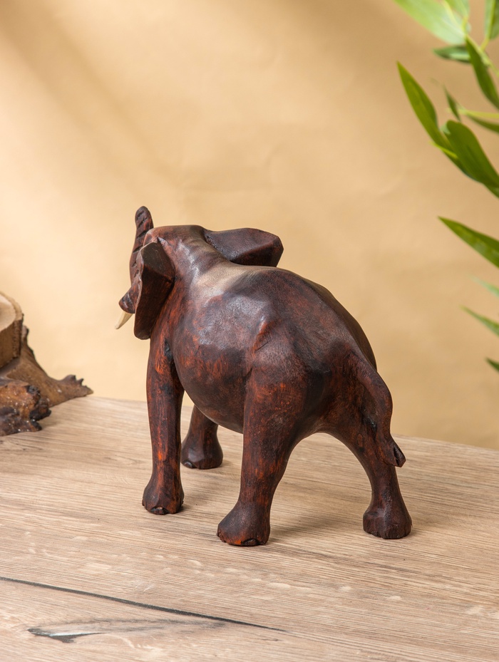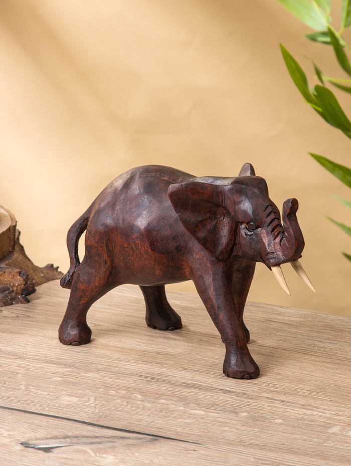 Деревянный слон из суара — компактная, но выразительная скульптура в тёмно-коричневом оттенке. Высота 16 см делает её идеальной для полки, рабочего стола или домашнего алтаря: заметной, но не громоздкой. Фигура передаёт силу и спокойствие без лишних деталей — только чистая форма и текстура живого дерева.
