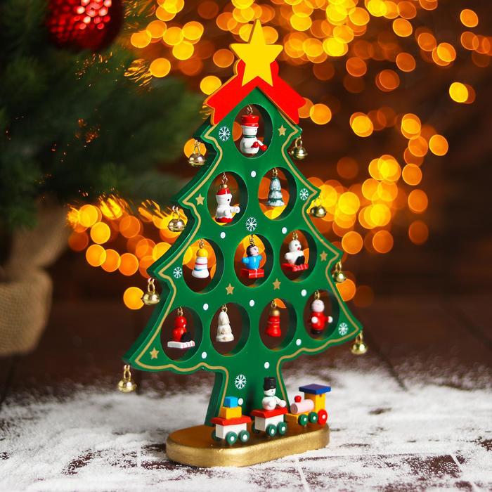 Симпатичные интересные подвески можно расположить по своему вкусу, а золотая звёздочка на макушке завершает тожественный образ лесной красавицы. Деревянная ёлочка на подставке не замёт много места и будет радовать взор в зимние праздники на протяжении многих лет.