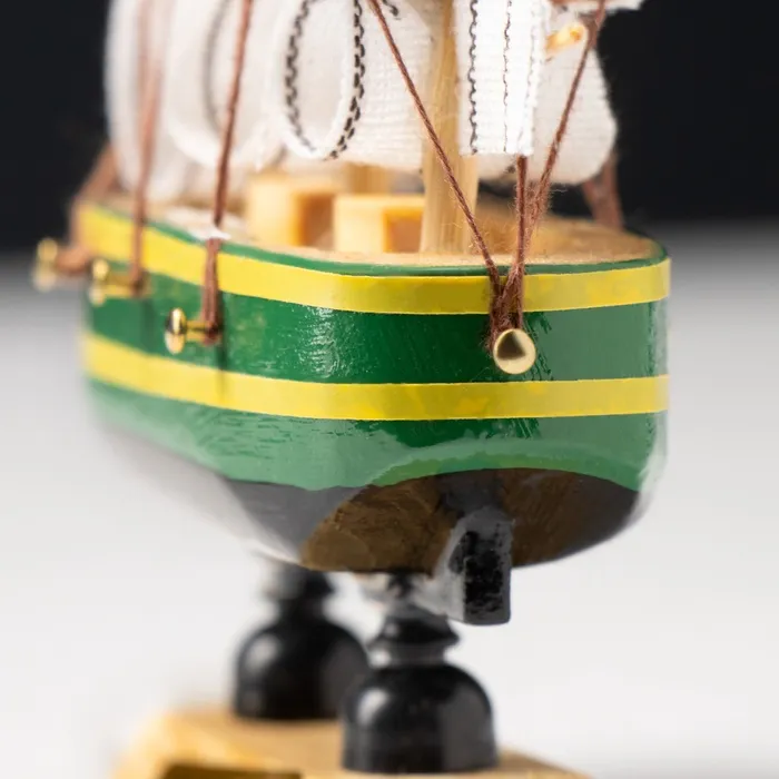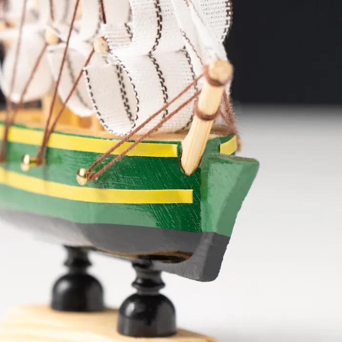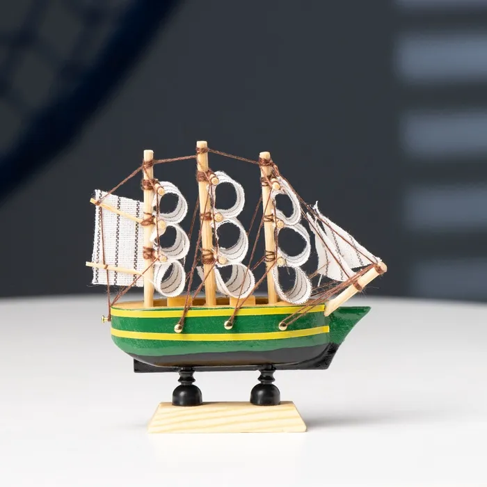 Миниатюрная модель корабля с зелёными бортами и белыми парусами станет отличным дополнением к коллекции или оригинальным подарком. Сувенир выделяется компактными размерами, что позволяет украсить им рабочий стол или полочку. Изготовленная из дерева и текстиля, эта модель придаст интерьеру неповторимое очарование.
