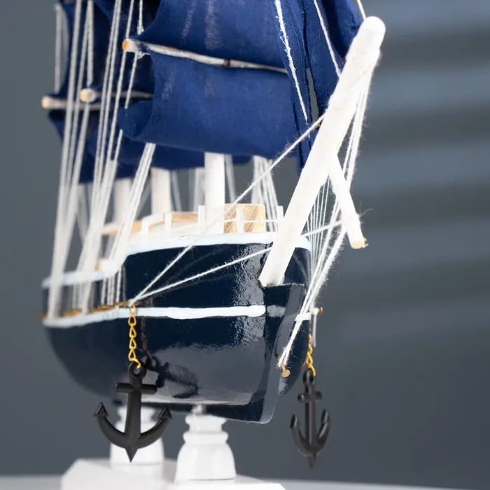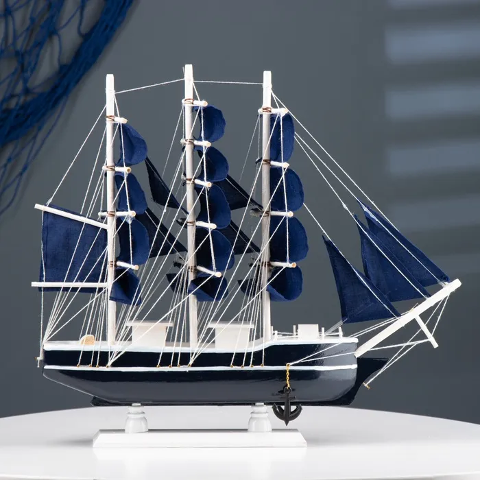 Сувенирная модель трёхмачтового корабля с синими парусами станет оригинальным подарком на праздник или стильным дополнением к интерьеру. У этой модели средний размер: длина — 40 см, что делает её идеальной для установки на полке или в офисе.