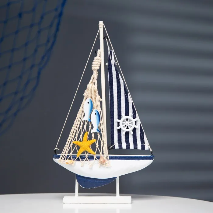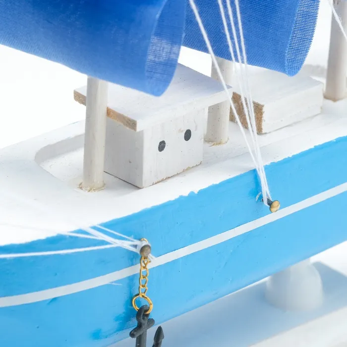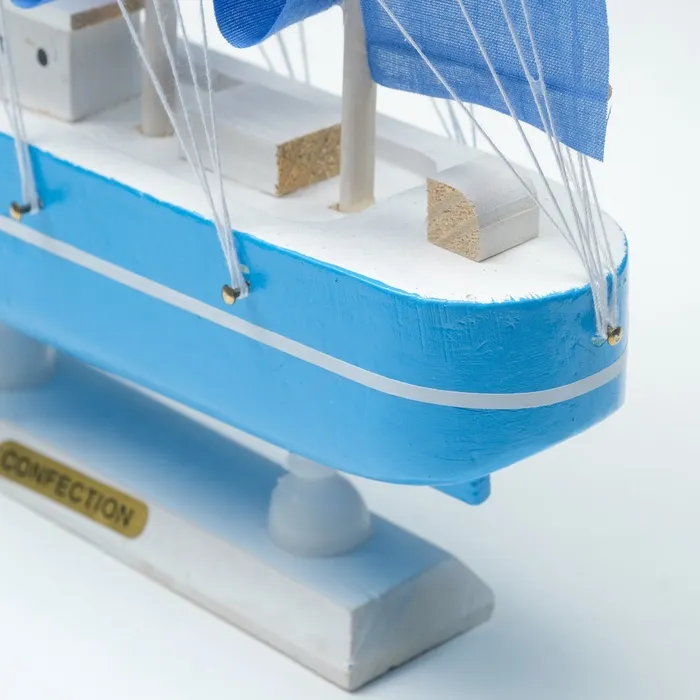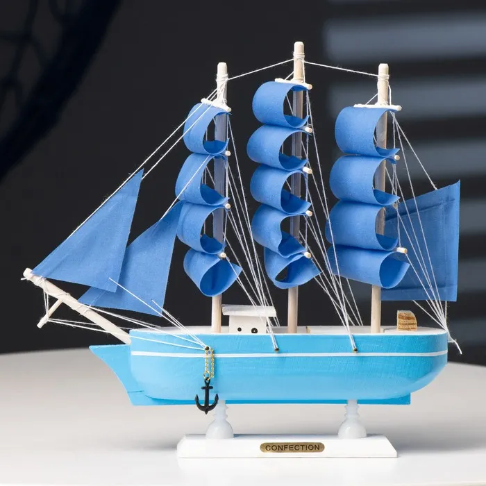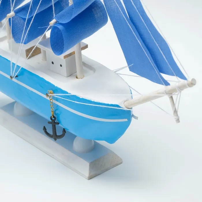 Сувенирная модель небольшого корабля в приглушенных оттенках голубого и синего станет отличным украшением для вашего интерьера или подарком любителю морской тематики. Этот небольшой парусник соединяет в себе очарование морских путешествий и искусство создания изящных макетов.