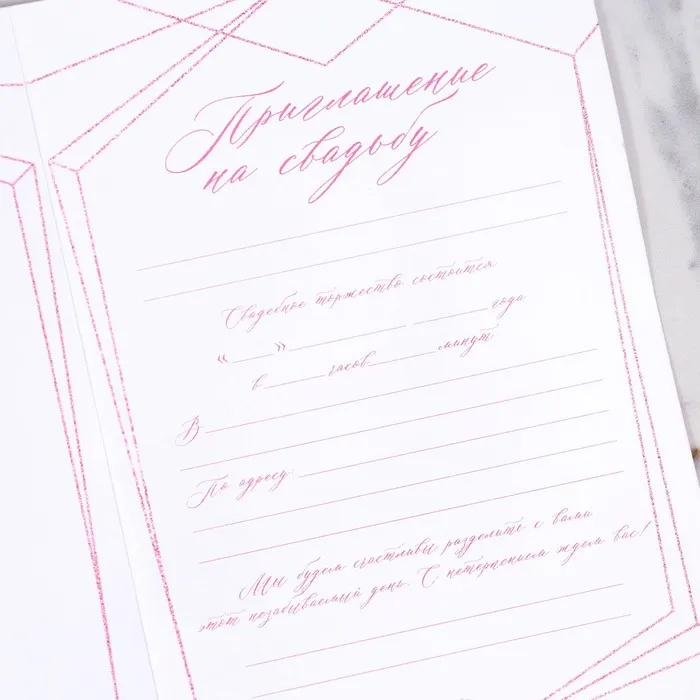 Когда дата и время бракосочетания уже известны, и вы определились со списком гостей, необходимо оповестить их о предстоящем празднике. Существует традиция делать персональные приглашения с указанием времени и даты мероприятия. Но перед свадьбой столько всего надо успеть, что на изготовление десятков открыток просто не остаётся времени. В этом случае вам придёт на помощь уникальное приглашение. Изделие выполнено из белой крафтовой бумаги плотностью 300 грамм и дополнено деревянным украшением в виде сердца. Это придаёт дорогой и роскошный вид. Текст приглашения содержит свободные поля для имени адресата, времени, даты и адреса проведения мероприятия. Это потрясающее приглашение достойно стать частью такого важного события в жизни, как свадьба!