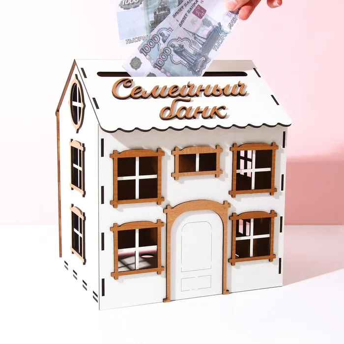 Свадебный или семейный банк из ХДФ 3 мм - казна для денежных подарков - станет незабываемым предметом декора на вашем торжестве. Красивый дом-шкатулка, куда гости могут складывать свои подарочные конверты. Семейный банк можно окрасить в цвет свадьбы аэрозольной краской, в баллончике. После церемонии этот сундучок можно использовать в интерьере, в быту, например, как шкатулка для хранения чего-либо. Прорезь для денег 20 х 1 см.