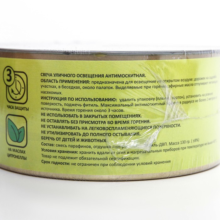 - Время горения свечи около 3 часов. Максимальный антимоскитный эффект в радиусе не более 2 метров от источника.