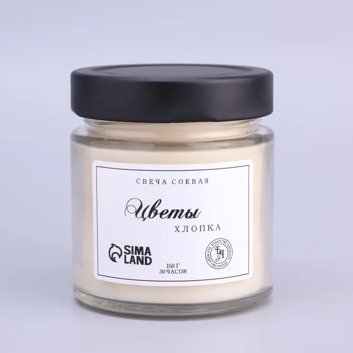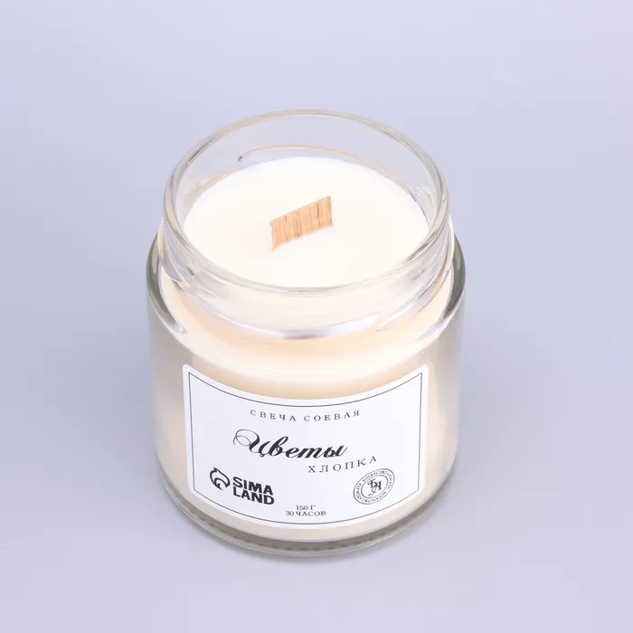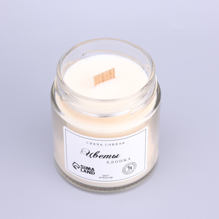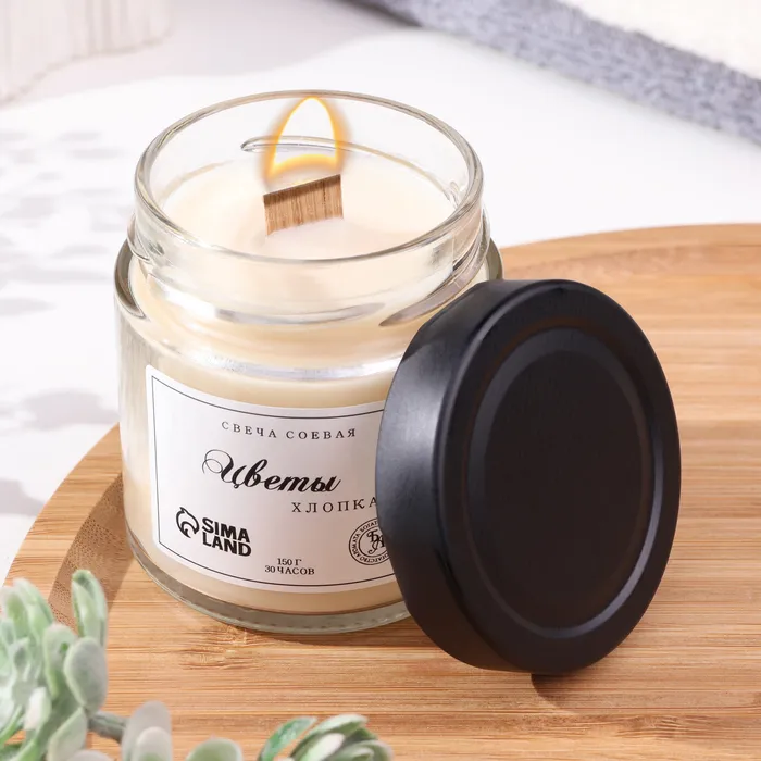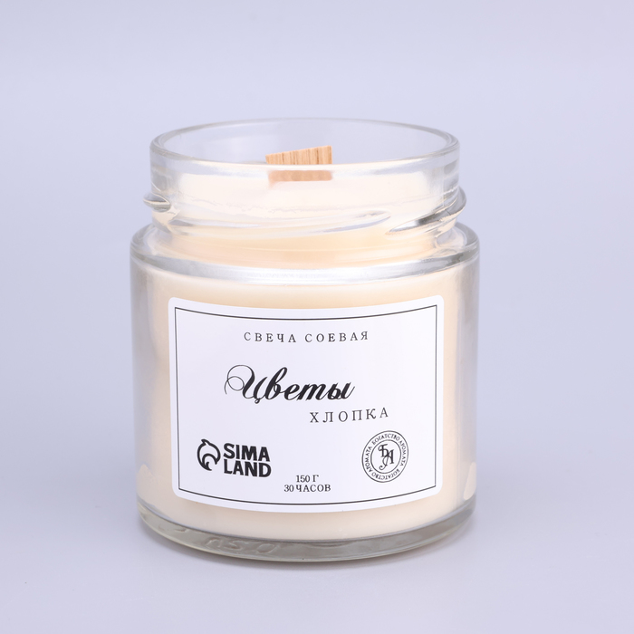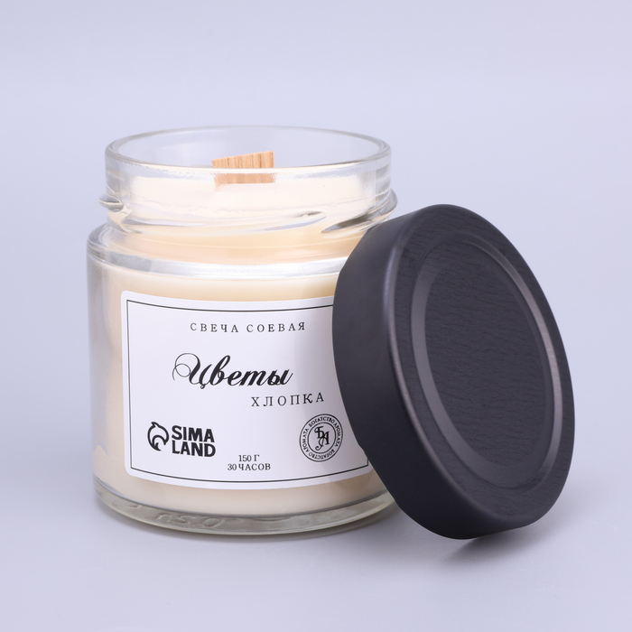 Свеча ароматическая из соевого воска в банке, 150 г, деревянный фитиль, цветы хлопка — Характеристики