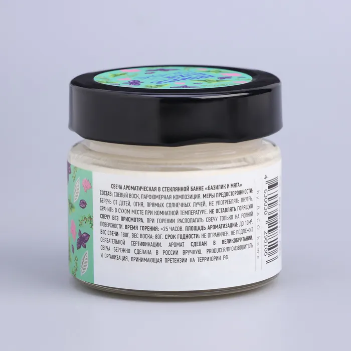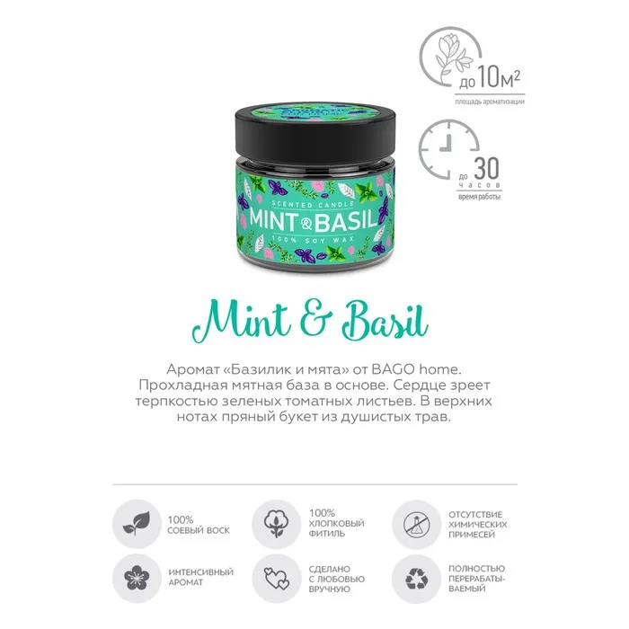 Ароматическая свеча "Базилик и мята" от BAGO home приглашает вас в летний сад с насыщенным ароматом душистых трав. Созданная из высококачественного соевого воска, эта парфюмированная свеча гарантирует до 25 часов чистого горения, покрывая площадь около 20 м2. Это не просто декор для дома, а настоящее ароматное путешествие в природу.