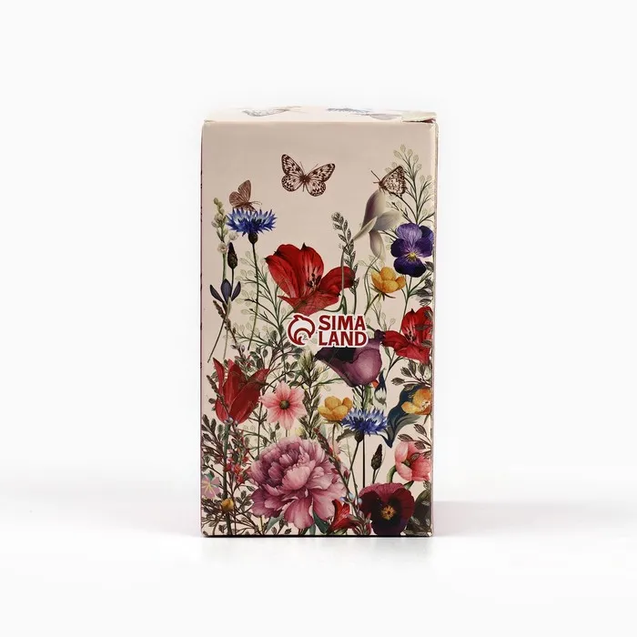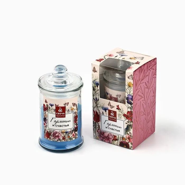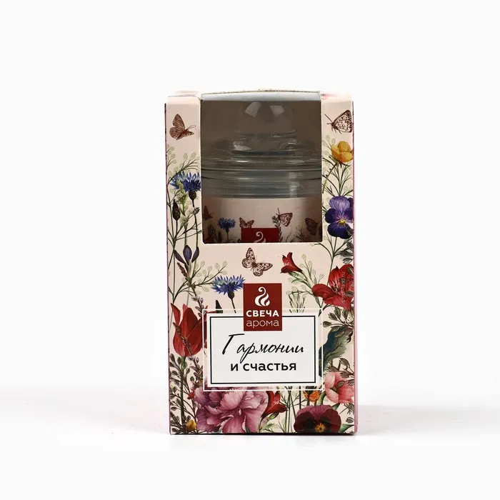 Она красиво упакована в коробку с изображением цветов, бабочек и надписью "Свеча Арома", что сделает ее еще более привлекательной.