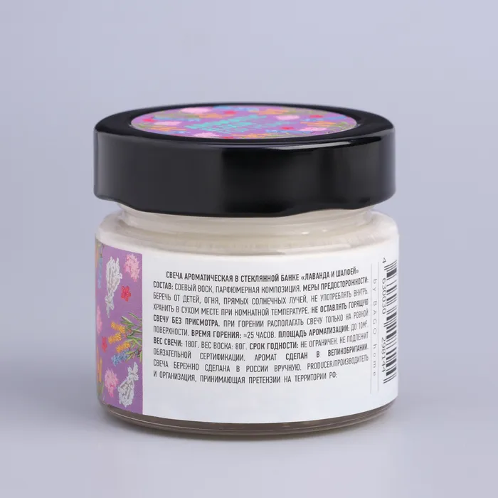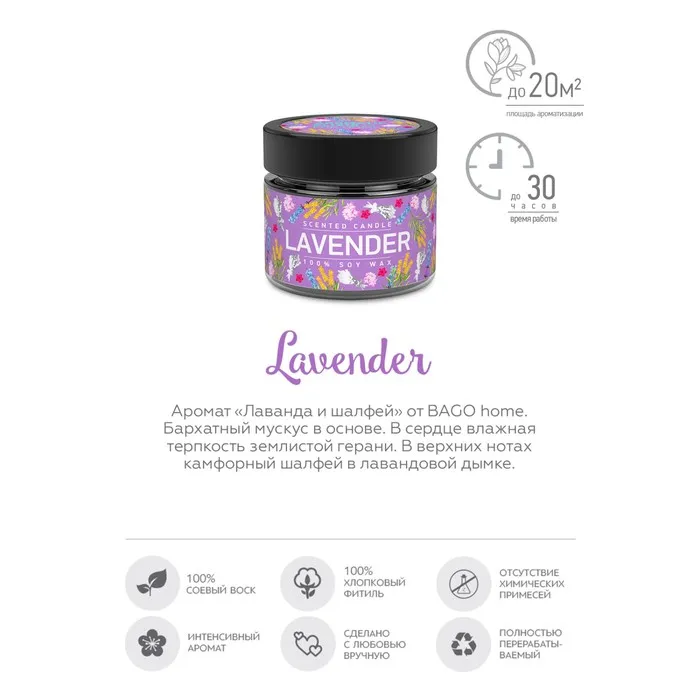 Ароматическая свеча "Лаванда и шалфей" от BAGO home переносит вас на бескрайние поля цветов, благодаря своему уникальному аромату. Свеча, выполненная в лиловом цвете и упакованная в стеклянный контейнер, обещает до 25 часов чистого и насыщенного горения, охватывая площадь до 20 м². Изготовлена из соевого воска премиум качества с добавлением натуральных ароматов, обеспечивая безопасность для людей и окружающей среды.