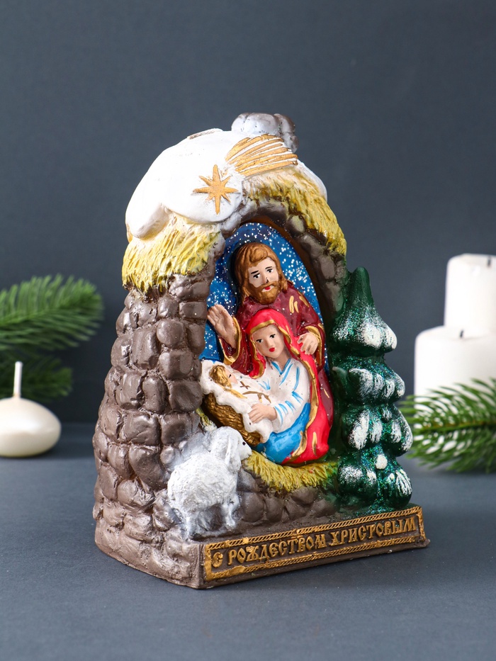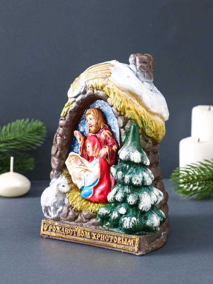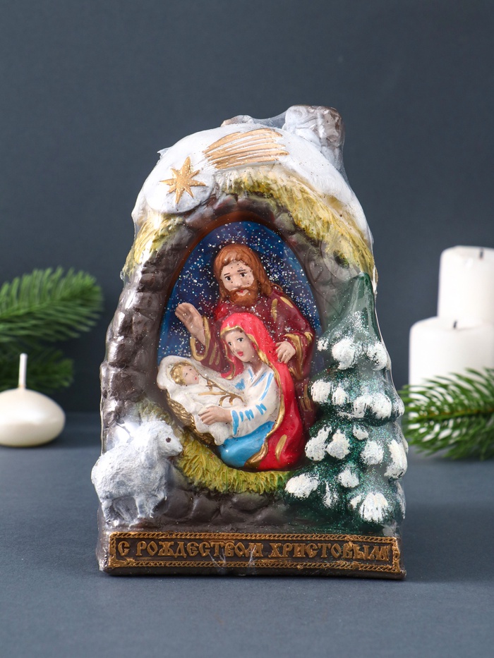 - Выразительный рождественский сюжет: Свеча украшена рельефным изображением сцены Рождества. При зажжёной свече игра света и тени оживляет фигуры, создавая волшебный визуальный эффект и напоминая о традициях праздника.