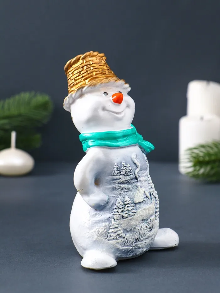 Представляем декоративную свечу, которая наполнит ваш дом атмосферой праздника и волшебства. Снеговик в золотом колпаке высотой 14 см станет ярким акцентом в новогоднем или зимнем декоре. Его размеры (8.5×5.5×14 см) делают его компактным, но при этом заметным элементом интерьера, который украсит полку, стол или каминную зону. Голубой цвет добавляет изделию свежести и гармонии, создавая ощущение зимней сказки.