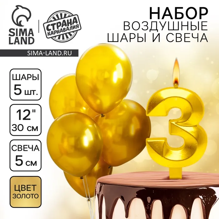 Свеча для торта, цифра 3 + воздушные шары, 5 шт, золото — Характеристики