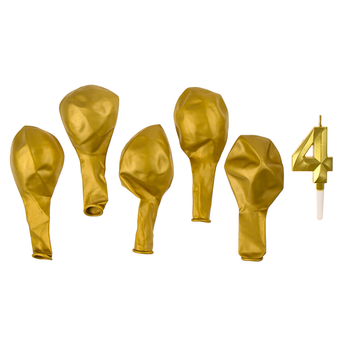 Свеча для торта, цифра 4 + воздушные шары, 5 шт, золото