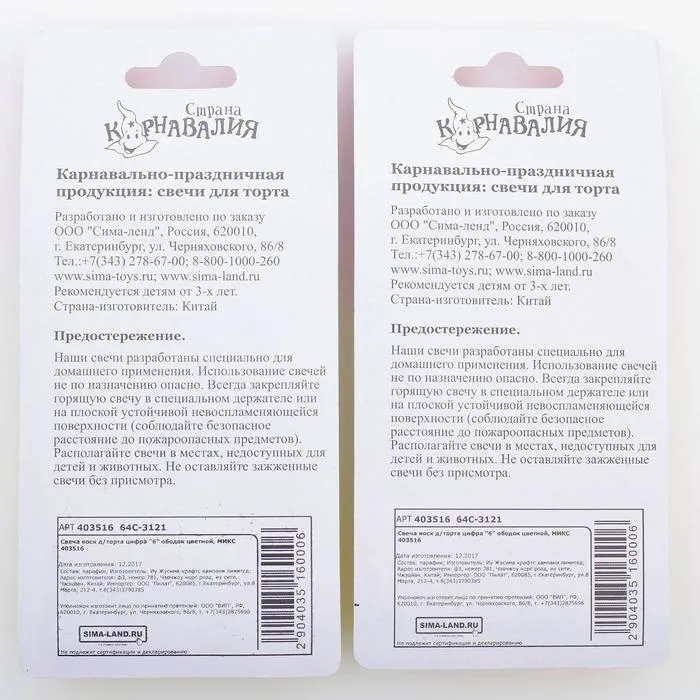 Свеча для торта «Цифра 6», 7 см, МИКС — Характеристики