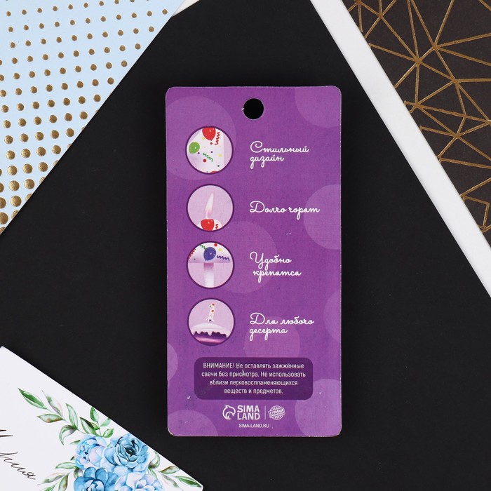 Свечи для торта на День рождения - неотъемлемая часть праздника. Украсьте угощение свечами, чтобы сделать особенный день в году ещё более ярким и незабываемым. Ведь задувание свечей вызывает бурные эмоции и у взрослых, и у детей, потому что в любом возрасте мы все мечтаем об исполнении желаний и для всех нас это один из самых трогательных и волшебных моментов. Яркие свечи украсят праздничный стол и создадут нужную атмосферу. Изготовлены из высокоочищенного пищевого парафина, который не влияет на вкусовые качества блюд, а удобная упаковка помогает сохранять свечи при длительном хранении и транспортировке.