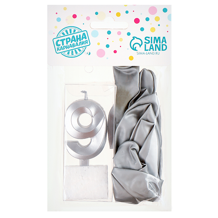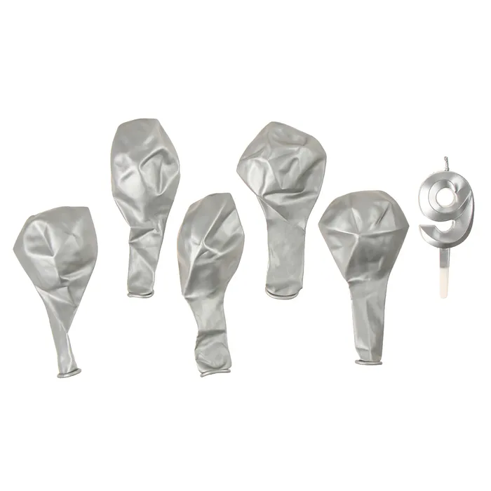 Свеча для торта, цифра 9 + воздушные шары, 5 шт, серебро