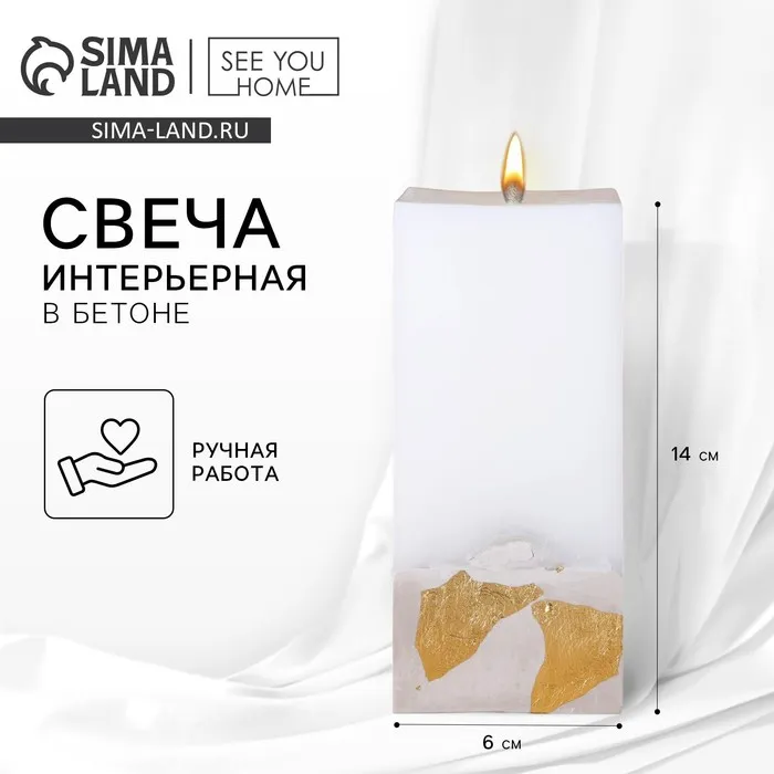 Свеча интерьерная, белая с бетоном и поталью, столбик, 6 х 6 х 14 см — Характеристики