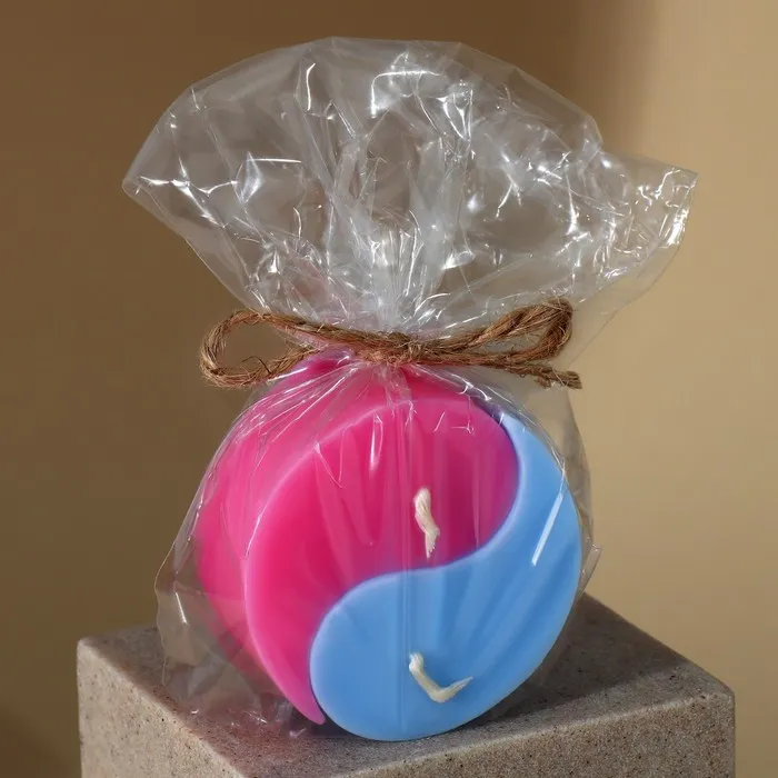 Свеча выполнена в виде двух полукругов, символизирующих Инь и Ян, и имеет нежный розовый цвет.