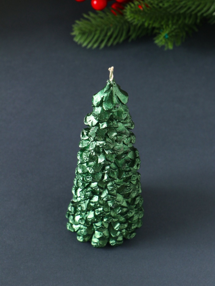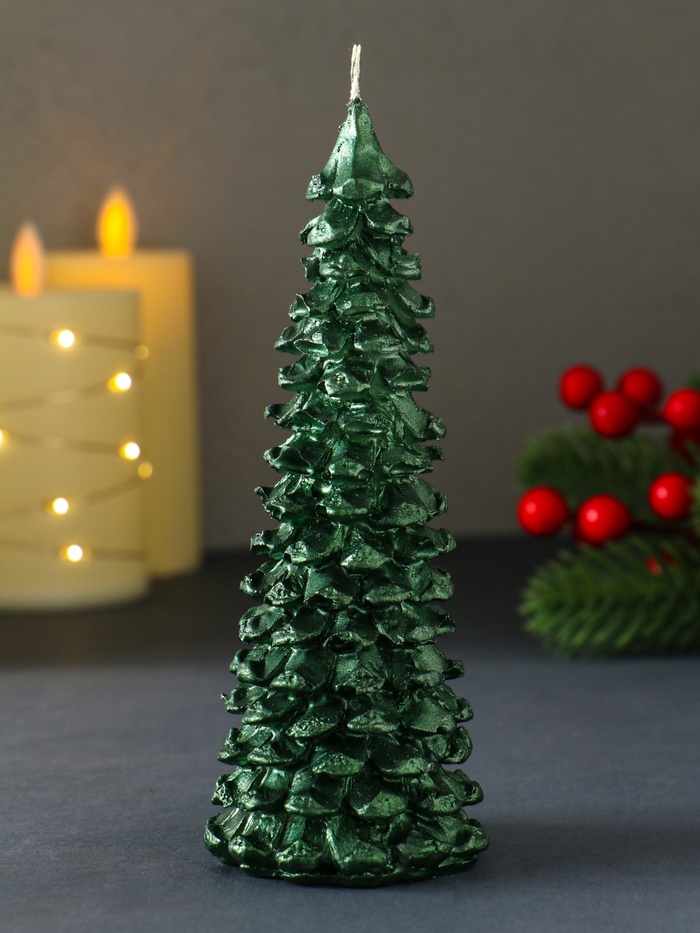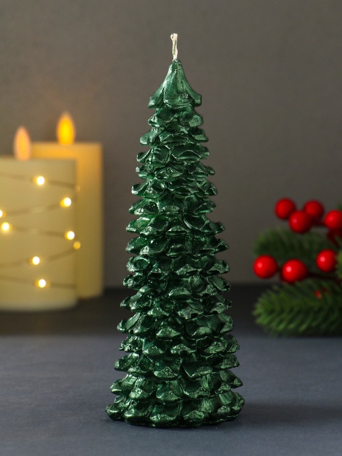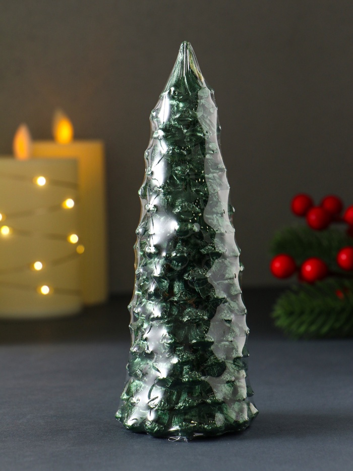 Эта высокая зелёная свеча создаёт в доме атмосферу зимнего праздника. Её классическая форма и глубокий цвет напоминают о пушистой ёлке, украшенной игрушками. Свеча горит ровно и долго, наполняя пространство тёплым, живым светом.
