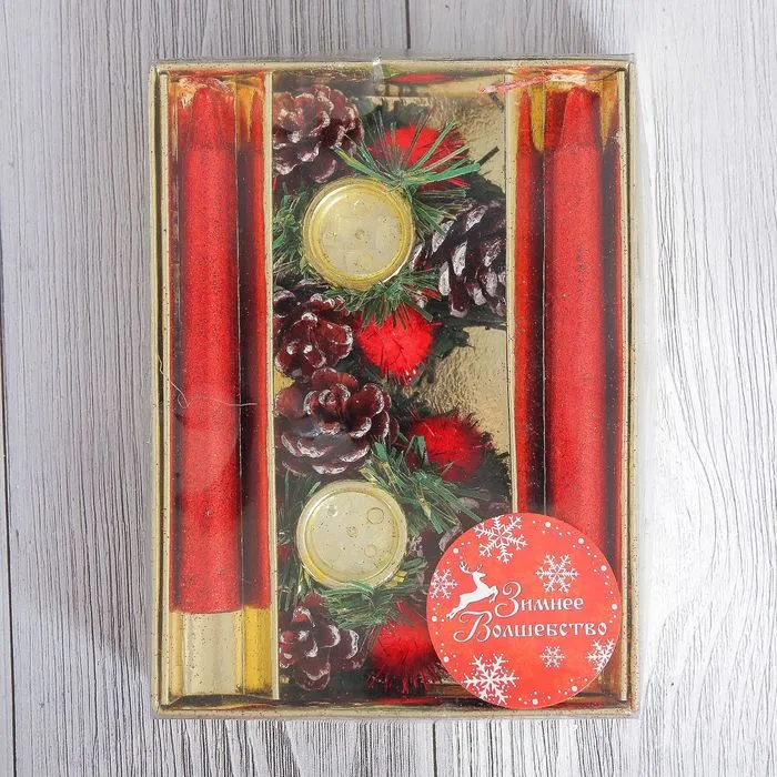 Новогодняя свеча с подсвечником «Блеск» — это тёплый и стильный элемент праздничного декора для создания атмосферы зимнего торжества. В наборе 4 комплекта, каждый из которых включает подсвечник и свечу. Высота изделия — 15 см, диаметр под свечу — 3,5 см. Красный цвет и сочетание материалов (пластик, металл, дерево, воск) создают ощущение зимней роскоши в духе новогоднего барокко, скандинавского уюта, фьюжн-стиля и советской эстетики.