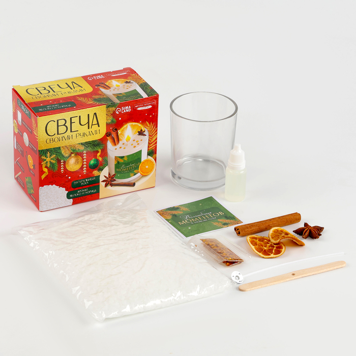 Пчелиный воск, белый, 200 грДержатель для фитиля, 11,5 х 1 смФитиль для создания свечей 12 смСтакан для свечи, 6,5 х 8,4 х 7 смБлестки звездочки, 1 грАроматизатор для свечи "Яблоко и корица", 10 млБадьян, 20 гр, 10 штКорица 7 см, 20 гр, 6 штСушенный апельсин, 20 гр, 6 штРадуйте себя и близких приятными минутами творчества!