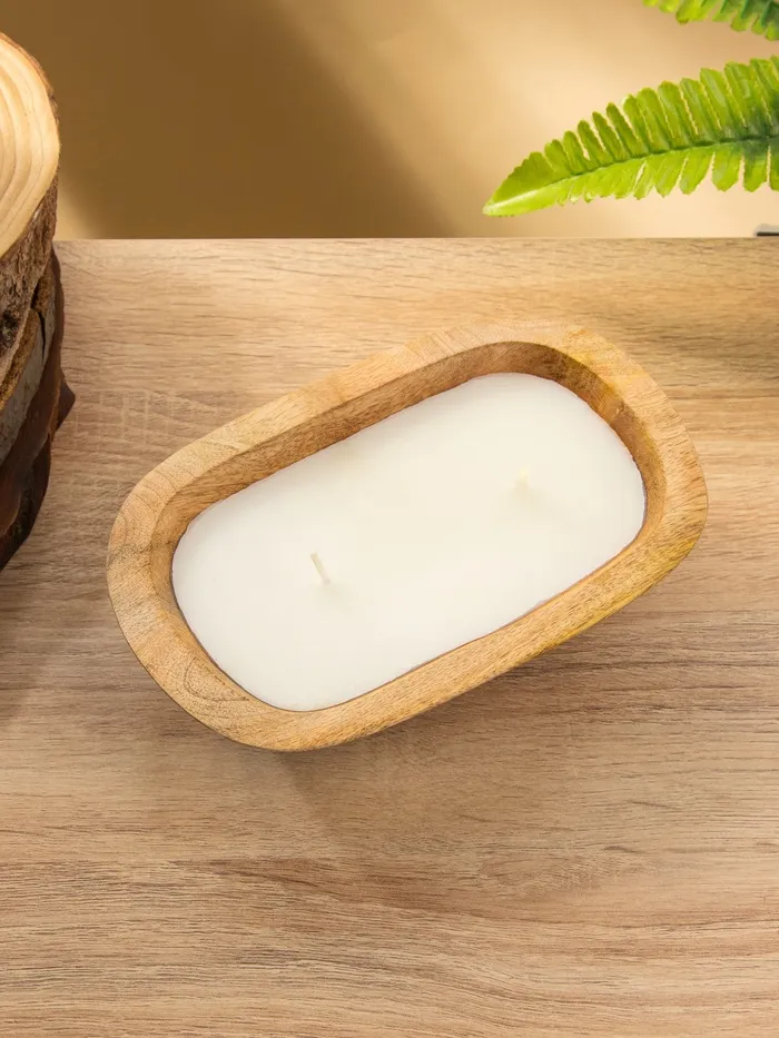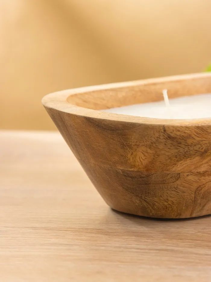 Свеча в деревянной чаше, парафин и соевый воск, 20×13×5.5 см