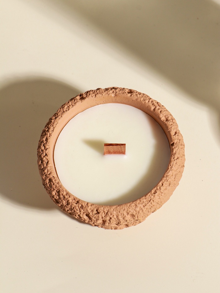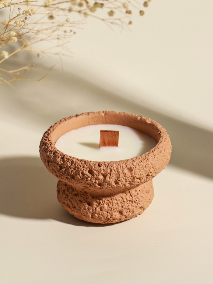 - Форма: свеча отлита в массивном бетонном подсвечнике, напоминающем чашу.