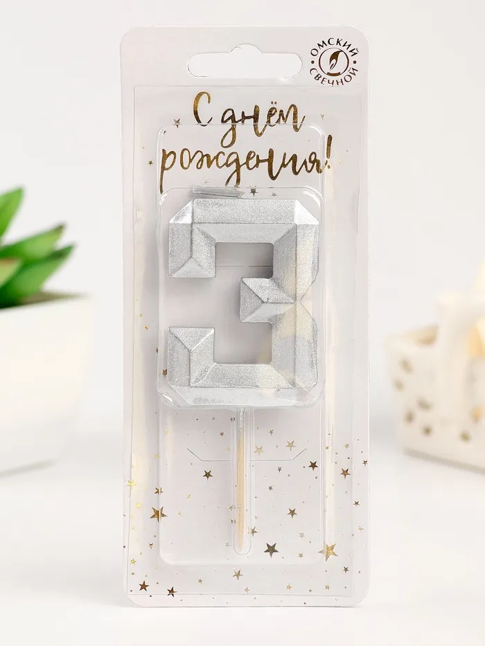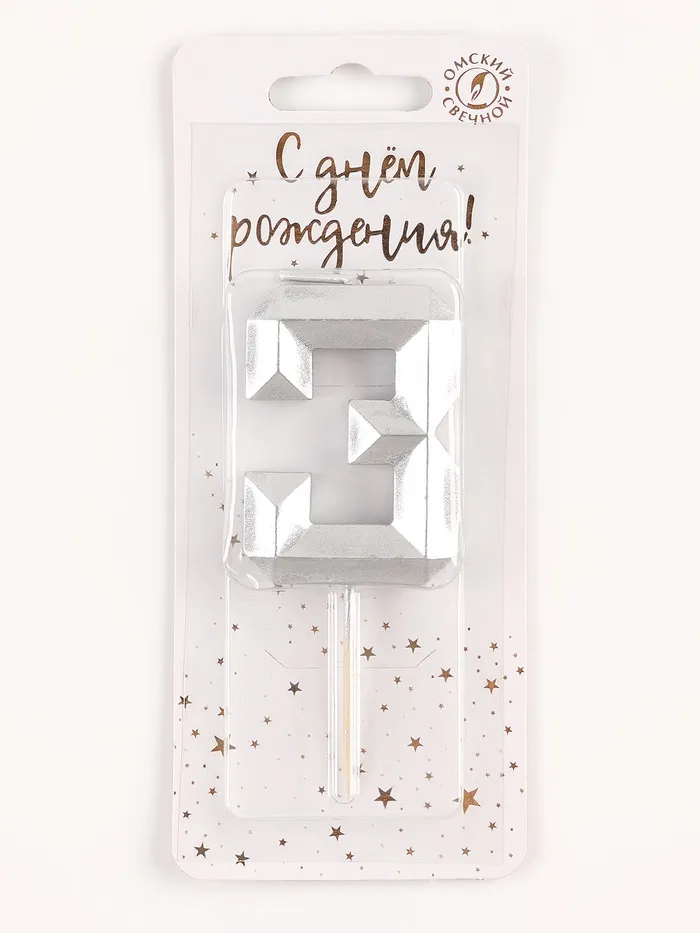 Свеча в торт на шпажке «Серебряные грани», цифра 3, серебряная — Характеристики