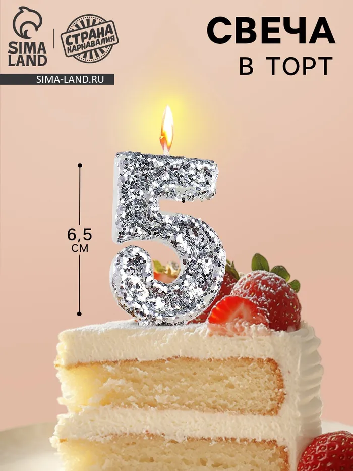 Свеча в торт с блестками «Цифра 5», 6.5×4 см, серебряная