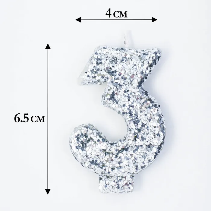 Свеча в торт с блестками «Цифра 3», 6.5×4 см, серебряная — Характеристики