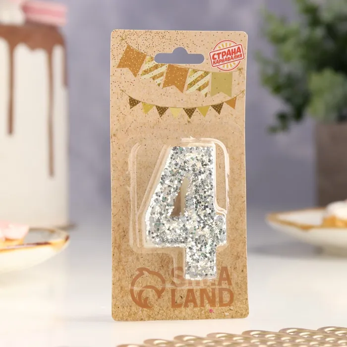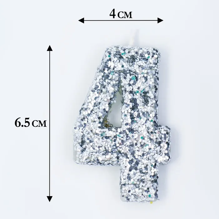 Свеча в торт с блестками «Цифра 4», 6.5×4 см, серебряная — Характеристики