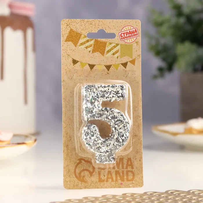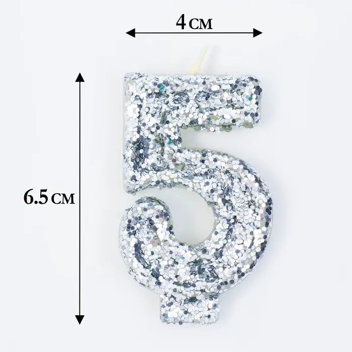 Свеча в торт с блестками «Цифра 5», 6.5×4 см, серебряная — Характеристики